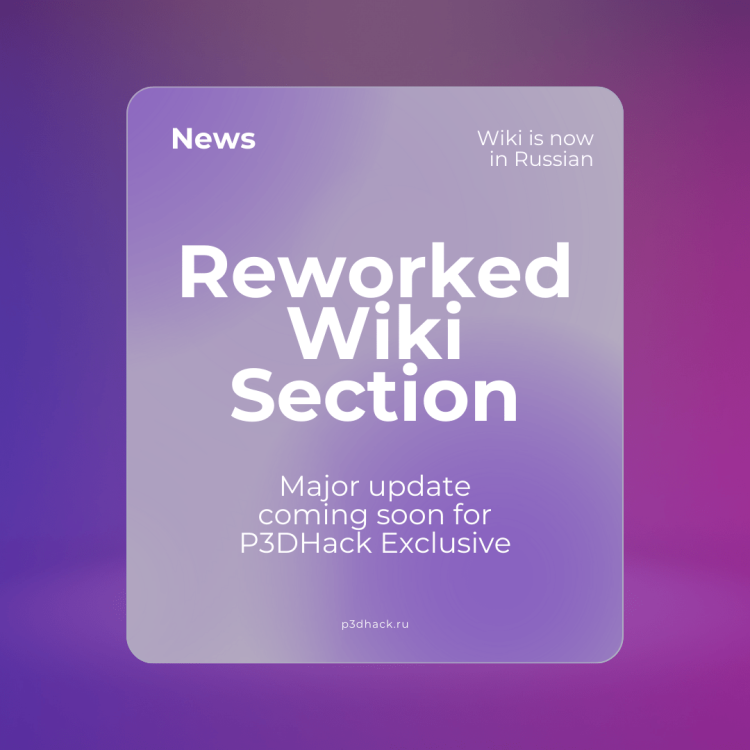 XMod: Reworked Wiki Added Russian language for XMod Wiki P3DHack Exclusive: We also plan to release a major update for P3DHack Exclusive in the near future and implement a Wiki with all the current questions and answers. Real life: I'm back from the hospital and, overall, I feel noticeably better, so we'll be back in the game soon with new functionality!